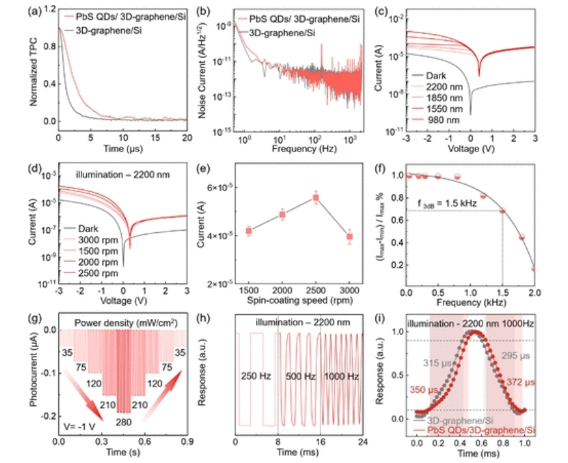 圖4. 用PbS量子點(diǎn)修飾前后異質(zhì)結(jié)的瞬態(tài)光電流衰減曲線(xiàn)(a)和頻率相關(guān)噪聲電流(b)。(c) I–V曲線(xiàn)在相同的光強(qiáng)度下但在不同的波長(zhǎng)下。(d) 相同波長(zhǎng)下不同旋涂速度的I–V曲線(xiàn)。(e) 不同旋涂速度的光電流統(tǒng)計(jì)圖。(f) 光電流振幅在不同調(diào)制頻率下衰減的特性。(g) PD在具有−1 V反向偏壓的2200 nm波長(zhǎng)照明下的響應(yīng)特性。(h) 在2200nm波長(zhǎng)照明下,PD對(duì)具有不同調(diào)制頻率的光的響應(yīng)。(i) 2200 nm波長(zhǎng)照明下PD的上升/下降時(shí)間。