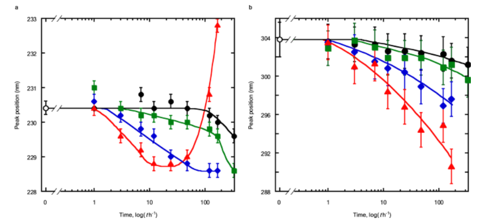 Fig 2. 峰位置隨成熟時(shí)間的變化。 aπ-π* 躍遷。b n-π* 躍遷。橫軸是對(duì)數(shù)刻度。成熟溫度:黑色實(shí)線和圓圈,298 K;綠色實(shí)線和方塊,308 K;藍(lán)色實(shí)線和鉆石,333 K;紅色實(shí)線和三角形,348 K。空心圓圈表示 GO 膠體在成熟前的峰值位置。誤差線代表至少三個(gè)測(cè)量的峰位置確定的再現(xiàn)性。