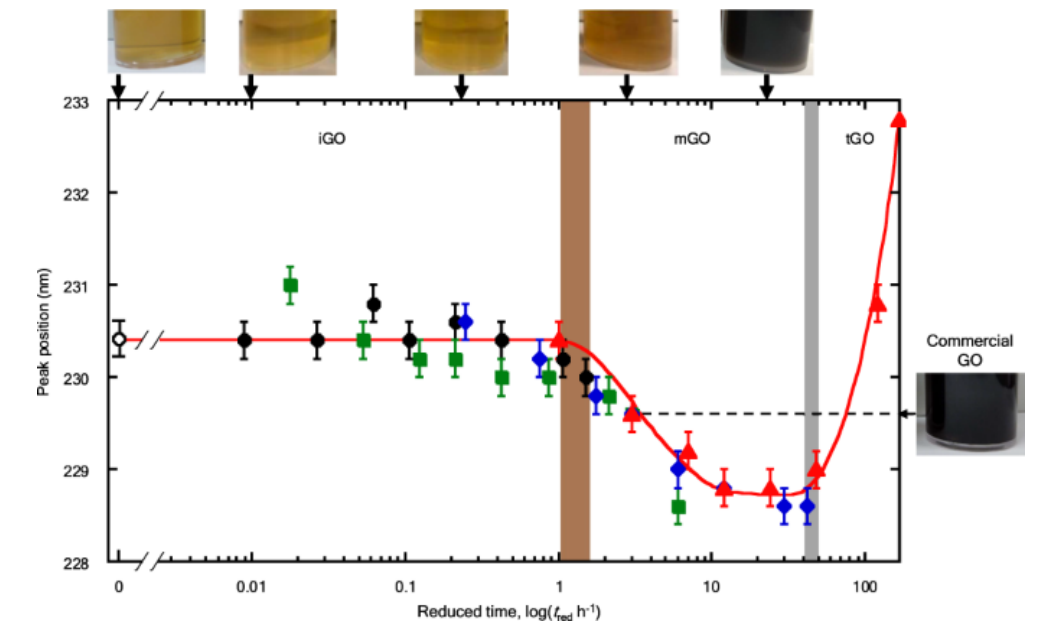 Fig 3. 在不同溫度下熟化不同持續(xù)時(shí)間的 GO 膠體的 π-π* 轉(zhuǎn)變峰值位置的時(shí)間過(guò)程縮短。橫軸是減少時(shí)間(tred)的對(duì)數(shù)。縮短的時(shí)間過(guò)程由歸因于內(nèi)在 GO (iGO)、亞穩(wěn)態(tài) GO (mGO) 和瞬態(tài) GO (tGO) 的三個(gè)區(qū)域組成。棕色和灰色區(qū)域代表過(guò)渡區(qū)域。 GO 膠體的照片顯示在圖表頂部;箭頭表示相應(yīng)減少的時(shí)間。右側(cè)顯示了商業(yè)GO的照片,其ππ*躍遷的峰值位置由箭頭和虛線表示。成熟溫度:黑圈,298 K;綠色方塊,308 K;藍(lán)色鉆石,333 K;紅色三角形,348 K。空心圓圈表示未成熟 GO 膠體的峰值位置。誤差線代表至少三個(gè)測(cè)量的峰位置確定的再現(xiàn)性。