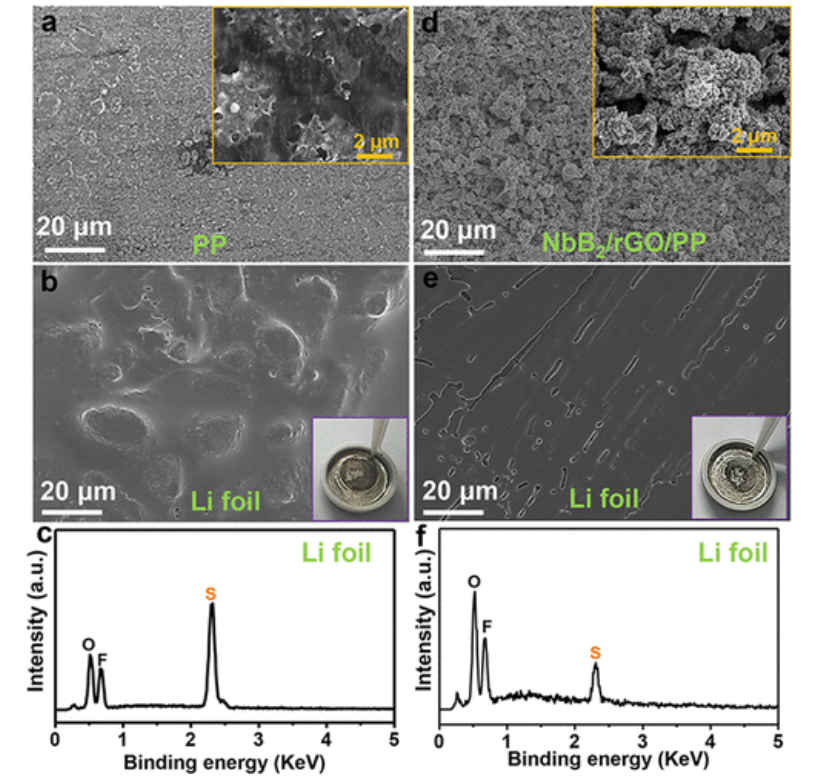 Fig 9. 循環(huán)后隔膜和鋰箔的形貌以及用 PP (a−c) 和 NbB