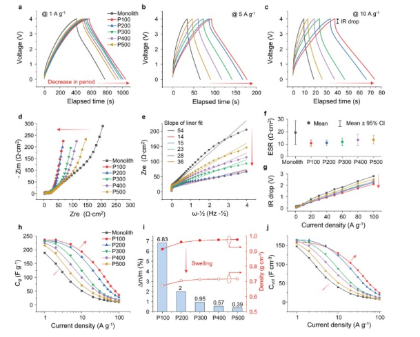 2 吸附/解吸等溫線,f) XRD,g) XPS 和 h) 單片和微孔陣列石墨烯薄膜的拉曼光譜。請(qǐng)注意,微孔陣列電極的周期為 100μm(e-h)。 i) 微孔的圖示可以實(shí)現(xiàn)電解質(zhì)的快速滲透。 j) 離子液體EMIMBF