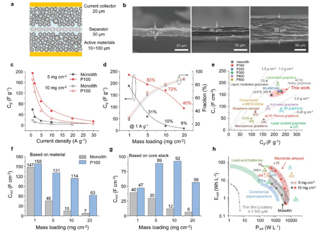 -1,,這是最先進(jìn)的石墨烯超級(jí)電容器之一。這項(xiàng)研究對(duì)結(jié)構(gòu)相關(guān)的電容特性進(jìn)行了全面的研究,指導(dǎo)高倍率和高質(zhì)量負(fù)載石墨烯超級(jí)電容器的電極設(shè)計(jì)。此外,這種設(shè)計(jì)還通過形成3D凝膠電解質(zhì)結(jié)構(gòu)使固態(tài)石墨烯超級(jí)電容器受益,從而實(shí)現(xiàn)更高的電容和更好的機(jī)械魯棒性,顯示出靈活能量存儲(chǔ)的潛力。