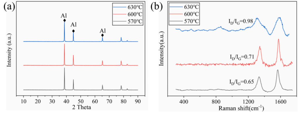 圖4. 不同溫度燒結(jié)下復(fù)合材料的XRD光譜(a)和Raman (b)光譜。
