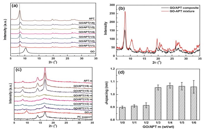 Fig 6. (A)GO、APT粉末和GO/APT復(fù)合材料的X射線衍射譜;(B)GO-APT混合物和GO/APT復(fù)合材料(1/2);(C)原始GO、純APT和GO/APT復(fù)合膜,以及(D)GO和GO/APT復(fù)合膜的相應(yīng)d間距。