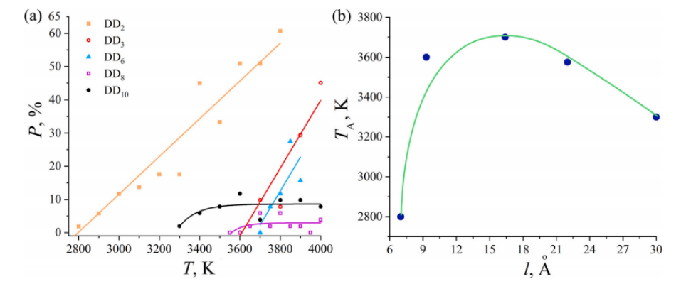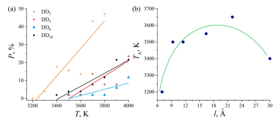 10的代表性樣品,SW缺陷形成的概率P與溫度的函數(shù)。符號表示數(shù)值型數(shù)據(jù),實線表示逼近曲線。(b)SW缺陷形成開始的溫度與偶極臂的函數(shù)。