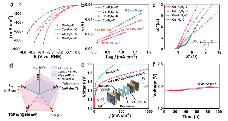 Fig 4. Co-PxN4-x-C (x = 0, 1, 2, 3)催化劑在1.0 M KOH電解液中的電化學性能。