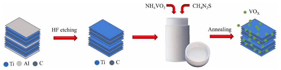 圖 1. VOx 錨定 Ti3C2TX 異質(zhì)結(jié)構(gòu)的合成示意圖。