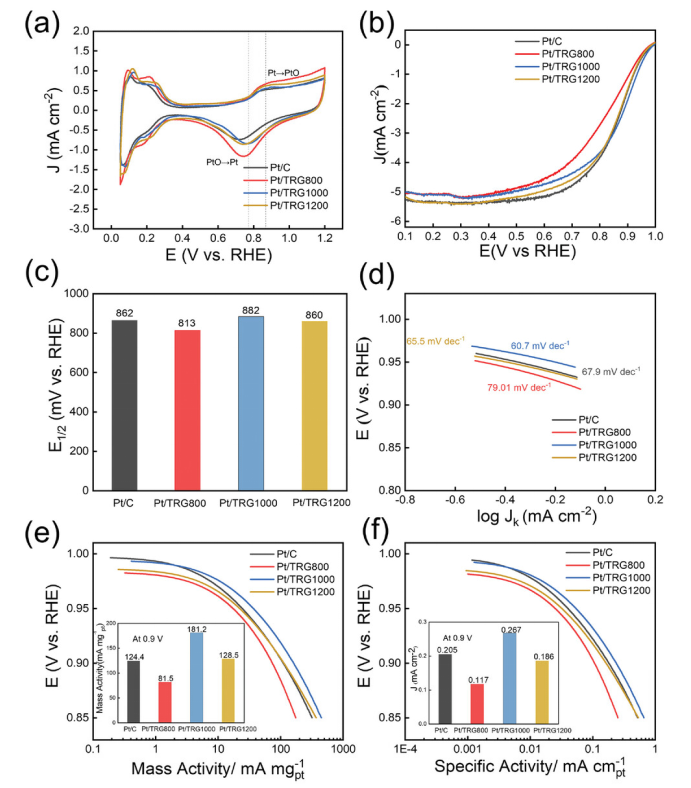 圖2. a) Pt/TRG800、Pt/TRG1000、Pt/TRG1200 和 Pt/C 的 CV 曲線。 b) Pt/TRG800、Pt/TRG1000、Pt/TRG1200 和 Pt/C 的 LSV 曲線。 c) 半波電位(E1/2); d) 塔菲爾圖,動力學(xué)電流密度曲線歸一化為 e) Pt 質(zhì)量和 f) Pt/TRG800、Pt/TRG1000、Pt/TRG1200 和 Pt/C 的 ECSA。