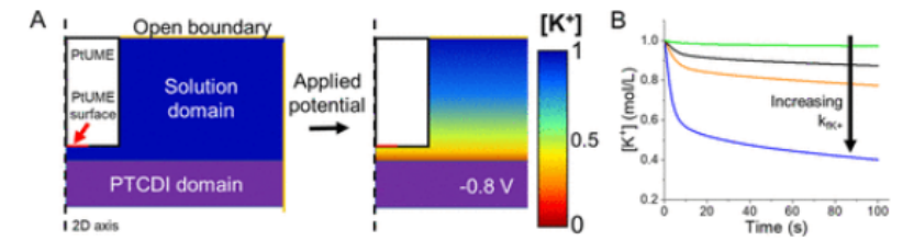 + 插入的 COMSOL 仿真。(A) 二維軸對(duì)稱模型和極化過(guò)程中的濃度梯度圖。(B) k