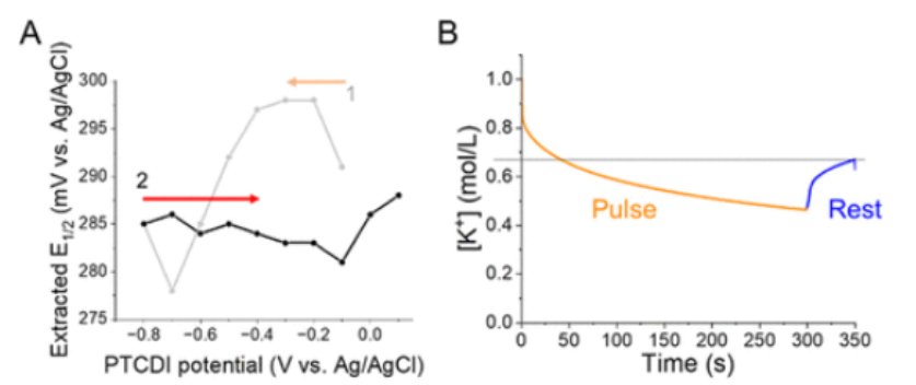 + 濃度。(A) PTCDI 電極在 1 M KCl 中的 CV 響應(yīng)。(B) 使用氧化還原介質(zhì)進(jìn)行離子感應(yīng)的概念。(C) 用于評(píng)估 PTCDI 的離子吸收的電位階躍模式。(D) PTCDI 電位階躍期間 PtUME 的一階導(dǎo)數(shù)響應(yīng)。