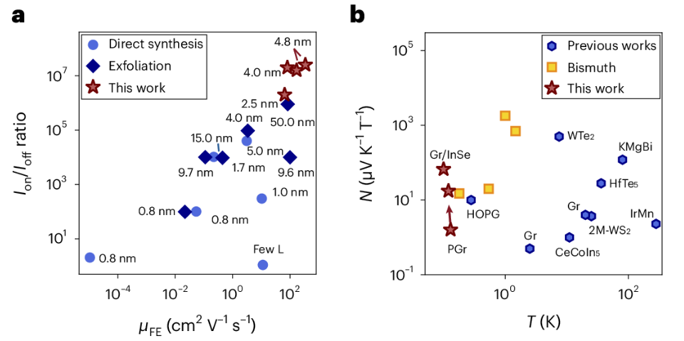 圖 4. a,最近在參考文獻(xiàn)中分別報(bào)道的基于 InSe 的器件的場(chǎng)效應(yīng)兩端電子遷移率和開/關(guān)比的基準(zhǔn)測(cè)試。每個(gè)點(diǎn)都以 InSe 通道的厚度標(biāo)記。本研究中測(cè)量的值指的是橫向電子傳輸,并用紅色星號(hào)表示,顯示開/關(guān)比和場(chǎng)效應(yīng)遷移率都有顯著改善。b,不同材料5、11、12、14、18、41、60、61、62 和幾何形狀63、64 的低溫能斯特系數(shù)值。特別是,鉍顯示為黃色方塊,因?yàn)閾?jù)我們所知,它具有迄今為止報(bào)道的最佳性能。本研究中測(cè)量的值顯示為紅色星號(hào)。紅色箭頭表示在改變柵極電壓時(shí),在 InSe 附近測(cè)量的石墨烯能斯特系數(shù)的可調(diào)性,優(yōu)于鉍。所有從文獻(xiàn)中獲取的值均在 1 T 下顯示,以便進(jìn)行有意義的比較,因?yàn)檫@些材料中的大多數(shù)在不同范圍的磁場(chǎng)下都具有較高的能斯特值。