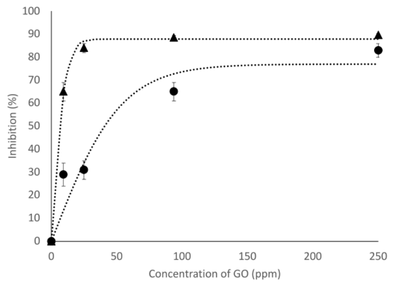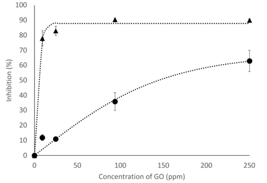 圖3. 在膽鹽(NaTC)存在(圓圈)或不存在(三角形)的情況下,不同濃度氧化石墨烯在2小時(shí)時(shí)對(duì)脂肪酶的抑制百分比。虛線只是為了說明趨勢(shì)。誤差條表示標(biāo)準(zhǔn)差。