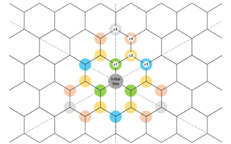 圖1. 氧化官能團(tuán)在氧化石墨烯上的不同分布位點。中間的灰色圓盤表示與原始氧化官能團(tuán)結(jié)合的初始位點,其他不同距離和相對位置的位點用不同顏色和數(shù)字標(biāo)記的圓盤來區(qū)分。