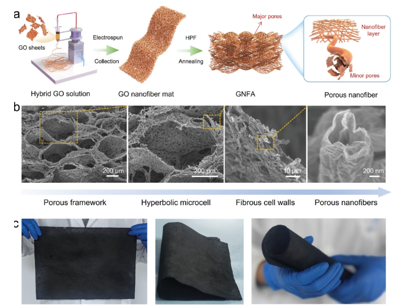 圖1. a) GNFA制備示意圖。b) SEM圖像的GNFA跨尺度結(jié)構(gòu)。c)有折疊和彎曲變形的大型樣品的數(shù)碼照片。