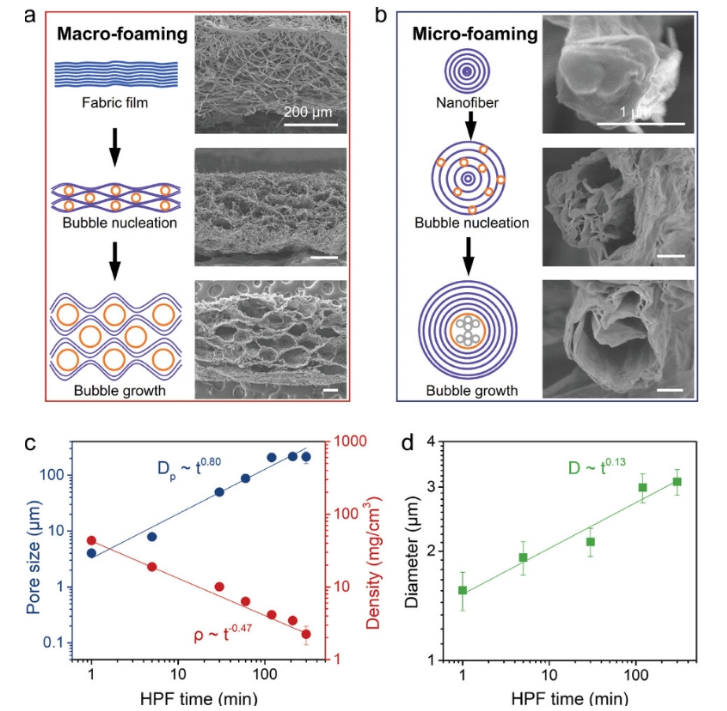 圖2. a)納米纖維層間大泡沫的圖解和結(jié)構(gòu)演化。b)纖維間微發(fā)泡的圖解和結(jié)構(gòu)演變。
