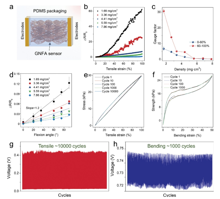 0。GNFA傳感器在疲勞試驗(yàn)中的機(jī)械性能(e)拉伸(1000次循環(huán))和(f)彎曲(10000次循環(huán))。GNFA傳感器的抗疲勞性能可達(dá)g) 100%拉伸應(yīng)變,10000次循環(huán),h) 50%彎曲應(yīng)變,1000次循環(huán)。