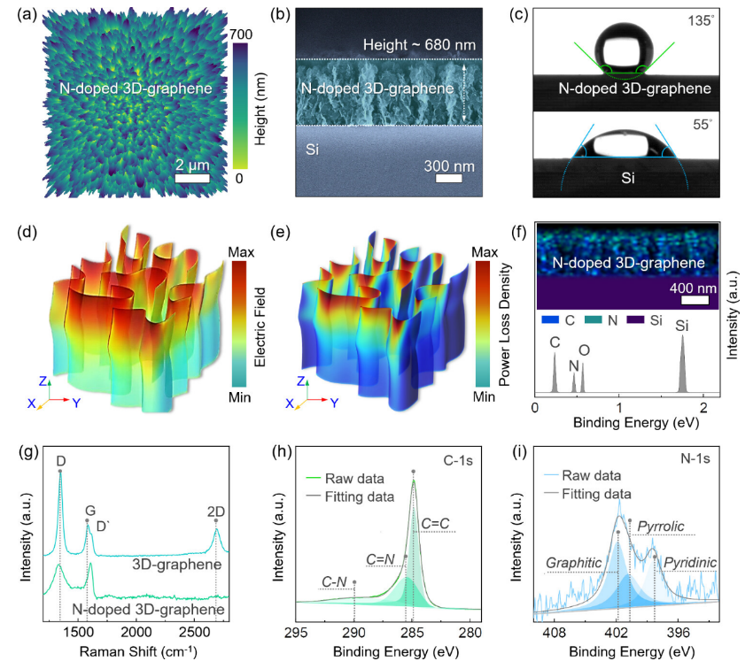 圖1. (a) N摻雜3D-石墨烯的三維AFM圖像。(b) N摻雜3D -石墨烯/硅異質(zhì)結(jié)的SEM橫截面圖。(c) N摻雜3D -石墨烯和Si的水接觸角測量值。(d) N摻雜3D-石墨烯異質(zhì)結(jié)歸一化電場分布的三維分布視角。(e) N摻雜3D-石墨烯歸一化功率損耗密度分布的三維分布視角圖。
