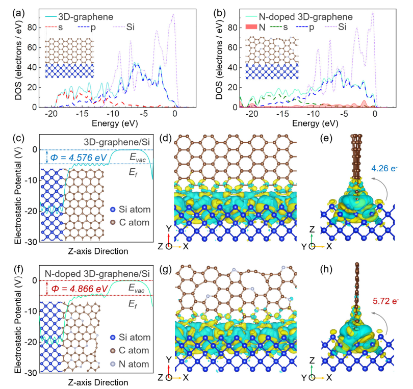3D -石墨烯/硅異質(zhì)結(jié)的電荷密度差(d)正視圖和(e)側(cè)視圖。(f) N摻雜3D -石墨烯/硅異質(zhì)結(jié)沿z方向的靜電電位。插圖描繪了N摻雜3D -石墨烯/硅異質(zhì)結(jié)的原子結(jié)構(gòu)模型。N摻雜3D -石墨烯/硅異質(zhì)結(jié)的電荷密度差(g)正視圖和(h)側(cè)視圖。黃色和青色分別代表電子的積累和消耗。