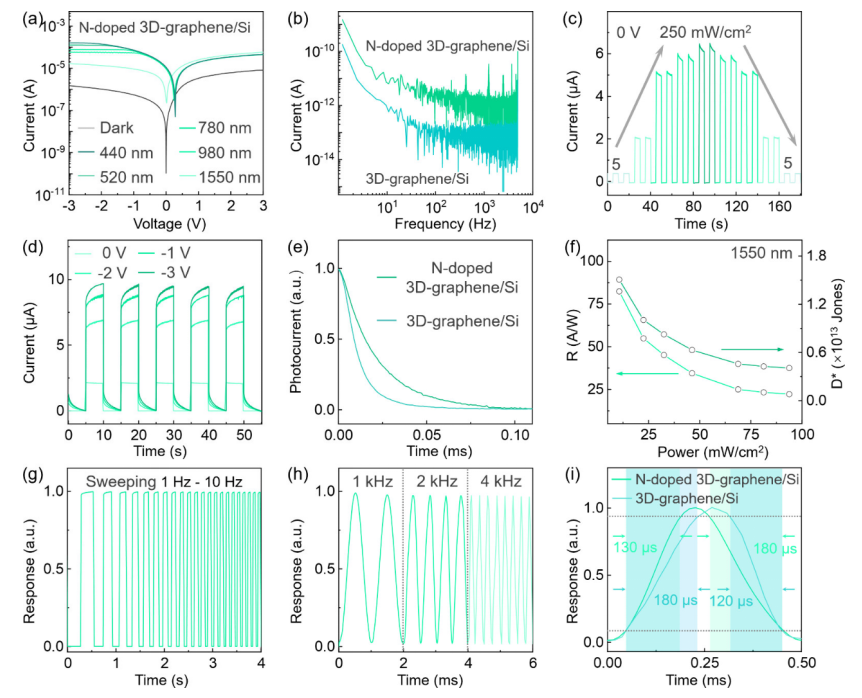 圖4. (a)不同波長光照下N摻雜3D -石墨烯/硅異質(zhì)結(jié)光電探測器的I-V曲線。(b)兩個光電探測器之間噪聲電流的比較。(c)基于N摻雜3D -石墨烯/硅異質(zhì)結(jié)的光電探測器在變強(qiáng)1550nm光照射下的光響應(yīng),偏置為0 V。(d)光電探測器在1550 nm光照射下,分別在偏置0、−1、−2和−3 V下的時間光響應(yīng)。(e)兩個光電探測器的瞬態(tài)光電流衰減曲線。(f) N摻雜3D -石墨烯/硅異質(zhì)結(jié)光電探測器的響應(yīng)率和比探測率。(g)線性掃描時間分辨光響應(yīng)。(h) N摻雜3D -石墨烯/硅異質(zhì)結(jié)光電探測器在不同頻率下的光響應(yīng)。(i)在2kHz記錄的部分光響應(yīng)曲線的放大圖像,說明兩個光電探測器的快速上升和衰減時間。
