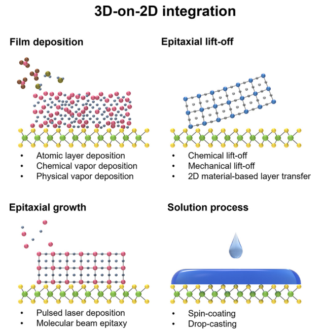 二維(2D)材料由于具有超高載流子遷移率、優(yōu)越的機(jī)械柔性和特殊的光學(xué)特性等下一代電子學(xué)所需的特殊性能而受到廣泛關(guān)注。盡管其潛力巨大,但實驗室到晶圓廠過渡的主要技術(shù)難點之一在于二維材料與經(jīng)典材料系統(tǒng)(通常由三維(3D)材料組成)的無縫集成。由于二維表面的自鈍化性質(zhì),在二維材料上形成三維材料異質(zhì)結(jié)構(gòu)(3D-on-2D)時,獲得定義良好的界面尤其具有挑戰(zhàn)性。在這里,本研究全面回顧了3D-on-2D摻入策略的最新進(jìn)展,包括直接生長到基于層轉(zhuǎn)移的方法以及從非外延到外延的集成方法。技術(shù)進(jìn)步和障礙進(jìn)行了嚴(yán)格的討論,以探索最佳的,但可行的,整合策略的三維對二維異質(zhì)結(jié)構(gòu)。最后,展望了混合維集成過程,確定了最新技術(shù)中的關(guān)鍵挑戰(zhàn),并提出了未來創(chuàng)新的潛在機(jī)遇。