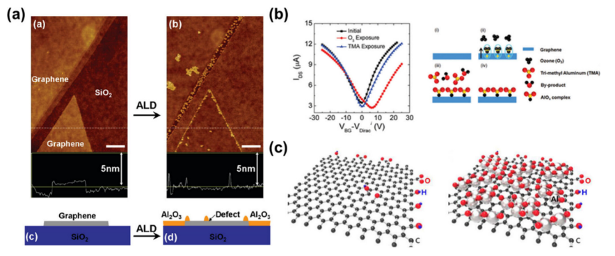 圖2. 二維材料上電介質(zhì)層的原子層沉積。(a) 原始石墨烯的Al