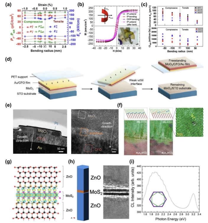 3/石墨烯垂直裝置示意圖。(g)SRO/STO襯底上生長的PMN-PT薄膜(左)、剝落的獨立PMN-PT膜(右上)和PMN-PT膜剝落后剩余的SRO/STO襯底的照片(右下)。比例尺,2 mm.(h)使用Ti(30 nm)/Ni(3μm)金屬應(yīng)力源層的剝落PMN-PT膜的橫截面透射電子顯微鏡(TEM)圖像。(i) 2ML石墨烯輔助外延層轉(zhuǎn)移:剝離100 nm厚STO(左)、CFO(中)和YIG(右)膜的示意圖(左)、照片(右上)和電子背散射衍射圖(右下)。