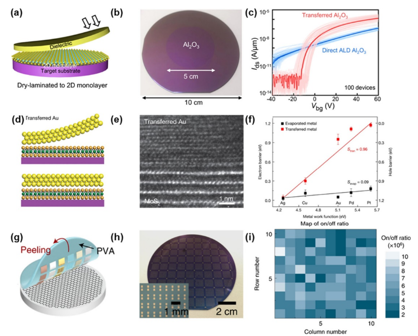 2頂部轉(zhuǎn)移的Au電極的橫截面示意圖和TEM圖像,具有原子銳利和干凈的金屬-半導(dǎo)體界面。(f) 不同金屬功函數(shù)的金屬-半導(dǎo)體結(jié)的肖特基勢壘高度。(g) 石墨烯輔助金屬轉(zhuǎn)移印花工藝示意圖。(h) 金圖案轉(zhuǎn)移到4英寸SiO