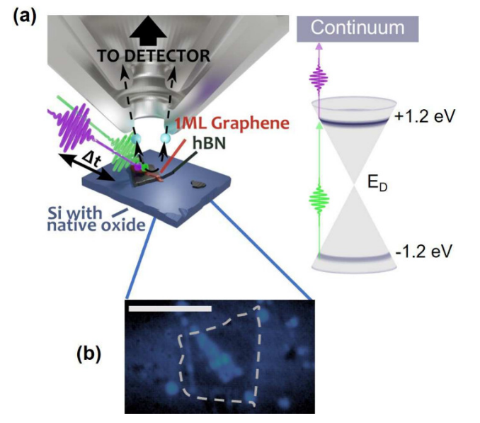 圖1. 實(shí)驗(yàn)概述。(a) 線極化泵浦脈沖(綠色)將電子提升到Dirac點(diǎn)(ED)上方1.2 eV,延遲的XUV探測脈沖將電子噴射到連續(xù)介質(zhì)中。(b) 石墨烯樣品的實(shí)空間PEEM圖像。虛線顯示hBN支持的區(qū)域。標(biāo)尺為50μm。