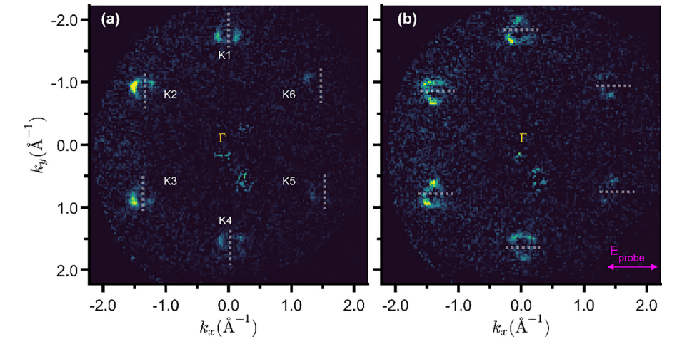 2,泵浦和探針極化方向分別用白色虛線和品紅箭頭表示。Γ點(diǎn)附近的強(qiáng)度是探測器的偽影。