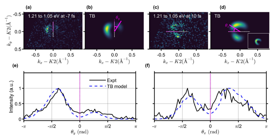 圖4. 與緊束縛(TB)理論的比較。(a,c)K2分別為y和x極化激發(fā)時(shí),Dirac點(diǎn)上方1.05至1.21 eV的電子Δt=0的動(dòng)量分布譜。(b,d)由TB模型預(yù)測的光電子動(dòng)量圖。(d)中的插圖是沒有泵矩陣元素,說明了所謂的“暗走廊”以及在沒有贗自旋極化的情況下信號(hào)的外觀。TB模型與(e)y極化和(f)x極化實(shí)驗(yàn)的角分辨強(qiáng)度比較。泵極化方向由頂部面板中的白色虛線指示。指定的泵節(jié)點(diǎn)由頂部面板中的細(xì)品紅線和底部面板中的品紅虛線表示。