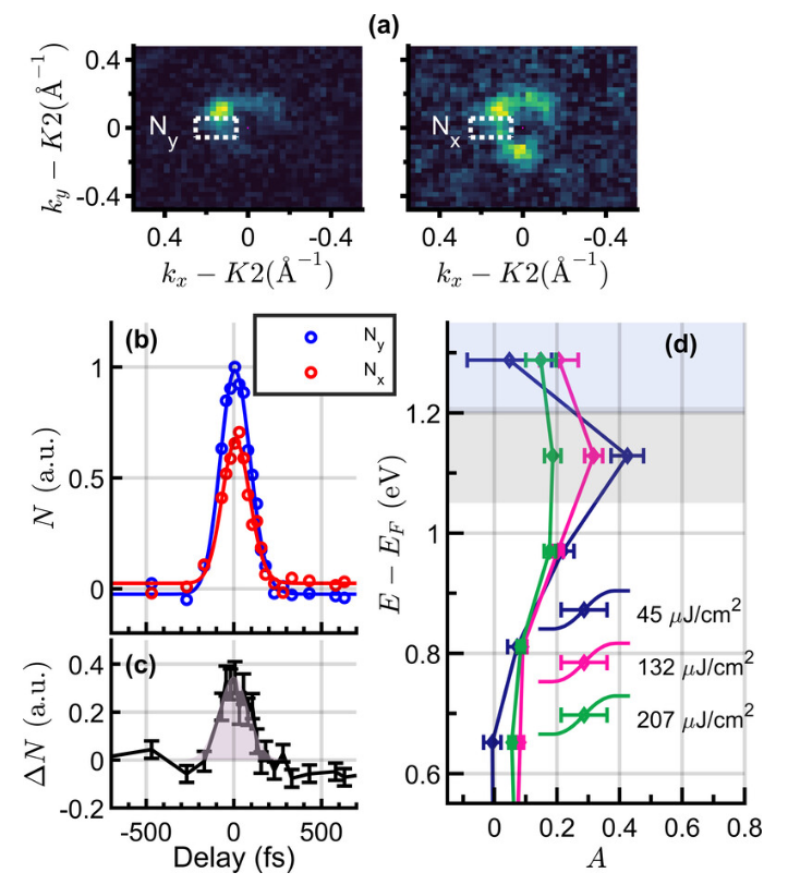 圖5. 贗自旋弛豫。(a) K2的ROI圖示。用y極化(左)和x極化(右)泵浦脈沖記錄數(shù)據(jù)。來自所有谷區(qū)中類似ROI的數(shù)據(jù)被組合以產(chǎn)生瞬態(tài)信號(hào)Ny和Nx,在所有能量>0.8 eV的情況下進(jìn)行積分。(b)Ny(藍(lán)色)和Nx(紅色)與泵/探針延遲的關(guān)系。(c) 差值ΔN=Ny–Nx(黑色)和IRF(灰色陰影)。布居數(shù)和各向異性都跟蹤IRF,表明弛豫比200 fs IRF快得多。(d) 不同注量下歸一化各向異性A與能量的關(guān)系。在較高的通量下,各向異性總體上減小,但通過更多的散射事件持續(xù)存在。
