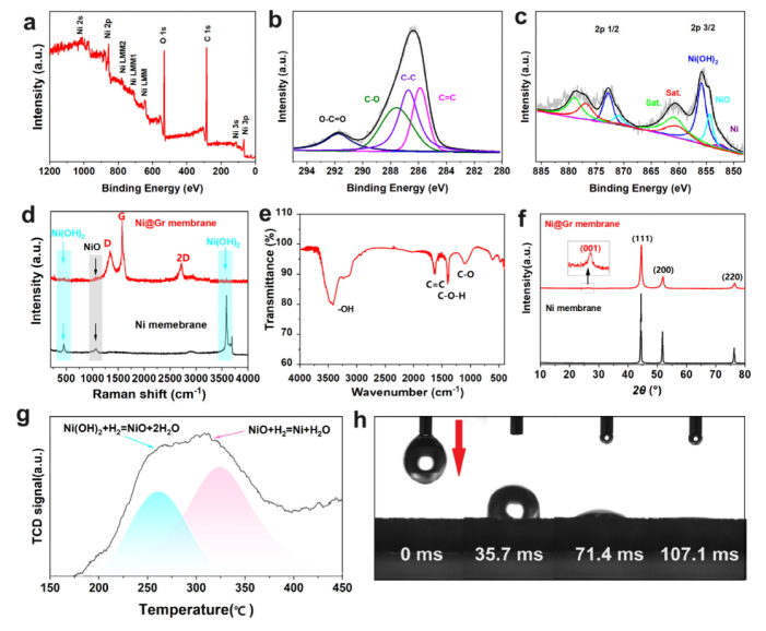 圖3. (a) XPS測量光譜Ni@Gr膜。(b) C 1s光譜Ni@Gr膜。(c) Ni 2p譜Ni@Gr膜。(d) 拉曼光譜Ni@Gr膜和鎳膜。(e) 紅外光譜Ni@Gr膜。(f) X射線衍射圖Ni@Gr膜和鎳膜。(g) H