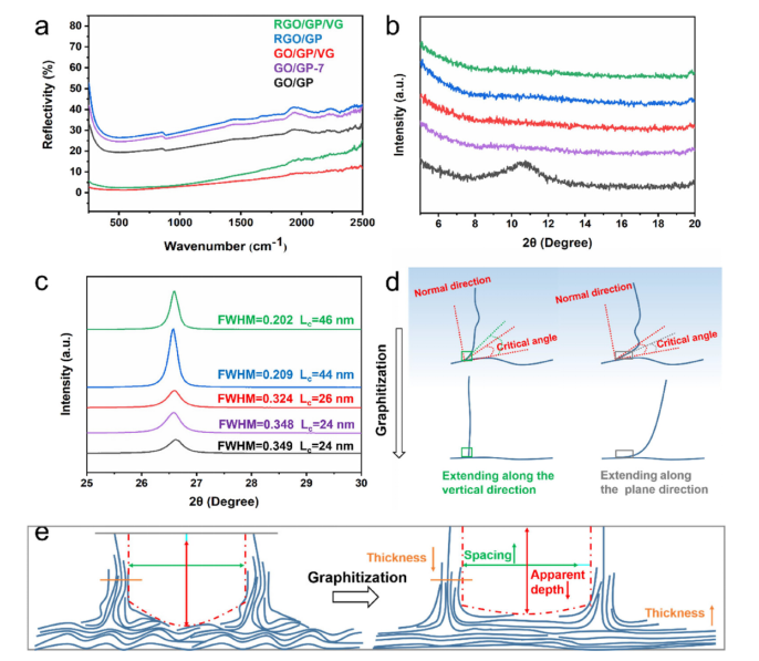 圖5. (a) 薄膜的漫反射光譜。(b,c)薄膜的XRD圖譜。(d,e)石墨化過(guò)程中VG的結(jié)構(gòu)演變。