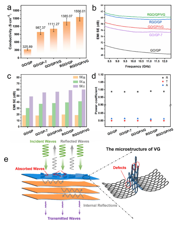 圖7. (a) 薄膜的導(dǎo)電性。(b,c)薄膜的電磁SE。(d) 薄膜的電磁屏蔽功率系數(shù)。(e) 薄膜的電磁屏蔽機(jī)理。