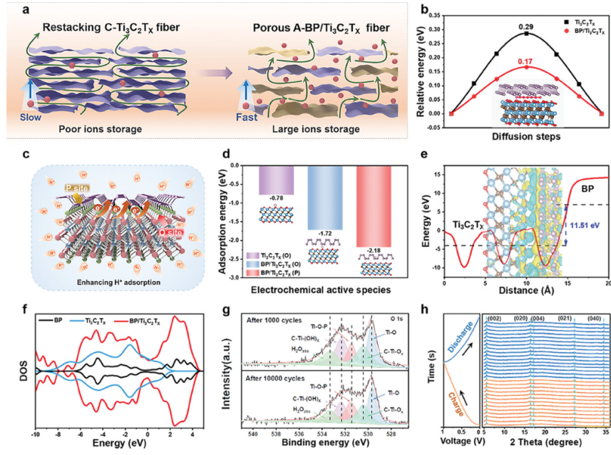 圖 4. A)re stack C-ti 3c 2 tx纖維和多孔A-BP/Ti3C2TX纖維中的離子傳輸路徑和存儲位置。b)ti 3c 2 tx和BP/Ti3C2TX中H+的擴(kuò)散能壘。c)BP/ti 3c 2 tx的O位和P位的機(jī)理圖解。d)計算的H+在Ti3C2TX的O位、BP/Ti3C2TX的O位和BP/Ti3C2TX的P位上的相對吸附能。e)計算的BP/Ti3C2TX纖維的平面平均靜電勢(插入:BP和Ti3C2TX之間界面的差分電荷密度分布)。f)BP、Ti3C2TX和BP/Ti3C2TX的狀態(tài)密度。g)A-BP/ti 3c 2 tx纖維在1000和10 000次循環(huán)后的O 1s的XPS光譜。h)在放電/充電過程中A-BP/Ti3C2TX纖維電極的原位XRD圖案的等高線圖和相應(yīng)的GCD曲線。