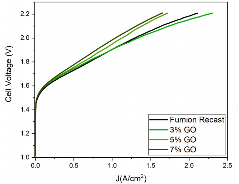 陰離子交換膜水電解槽(AEMWE)有望結(jié)合液體堿性電池和PEM技術(shù)的優(yōu)勢(shì),提供更高純度的氫氣生產(chǎn),提高效率和動(dòng)態(tài)性能。然而,AEM系統(tǒng)面臨著顯著的挑戰(zhàn),特別是在提高離子導(dǎo)電性和膜的穩(wěn)定性方面。特別是,AEMs的堿性化學(xué)穩(wěn)定性是最大的問(wèn)題之一,因?yàn)樗梢允褂酶邏A性溶液作為電解質(zhì)。為了克服這些問(wèn)題,在這項(xiàng)工作中,選擇的策略是在膜的聚合物基質(zhì)中簡(jiǎn)單地添加無(wú)機(jī)填料。使用改進(jìn)的Hummers方法合成了不同數(shù)量的氧化石墨烯(GO),并將其摻入基于Fumion的膜中。所得到的AEMs表現(xiàn)出更好的吸水性、化學(xué)穩(wěn)定性、熱穩(wěn)定性,并且在添加適量填料的情況下,電導(dǎo)率也有所提高。特別是,所有復(fù)合膜在80℃、6 M KOH中浸泡170 h后,失重和電化學(xué)損失都有所減少。在計(jì)時(shí)電流測(cè)試中,含有3%氧化石墨烯(wt%)的Fumion-GO AEM的電導(dǎo)率有所提高,在2 V和60℃下的電流密度高于1 A /cm