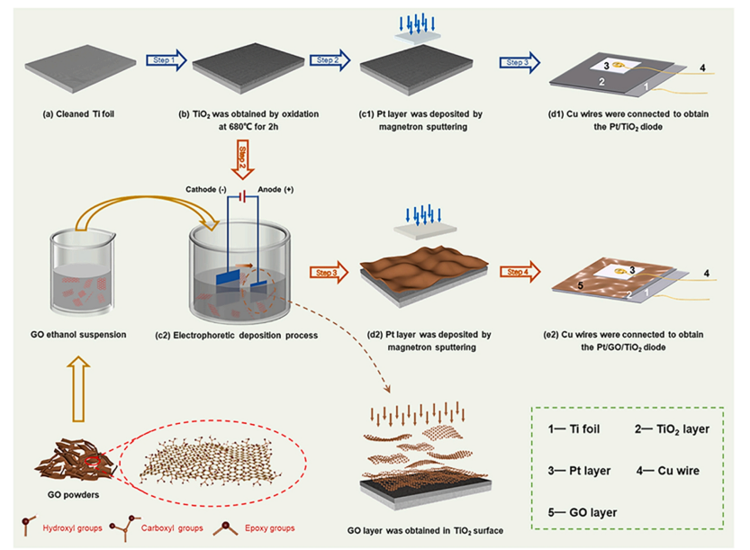 2傳感肖特基二極管的這一問題,設(shè)計(jì)了一種鉑/氧化石墨烯/二氧化鈦(Pt/GO/TiO2)肖特基二極管。在50 nm厚的Pt納米層和TiO
