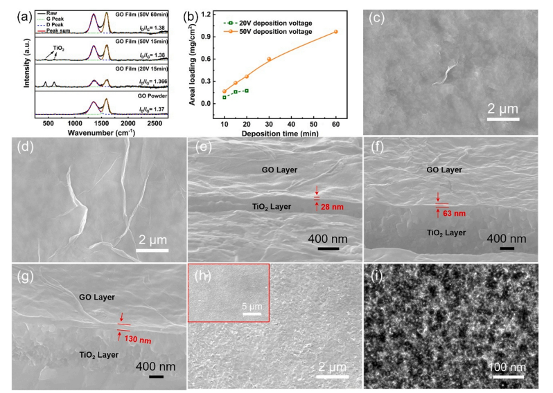 圖2. (a) GO 層和 GO 粉末的拉曼光譜。(b) 在不同 EPD 參數(shù)下沉積的 GO 層的面載荷。TiO