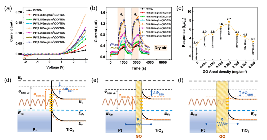 圖3. (a) 298 K 干燥空氣中的 I-V 曲線,(b) 開啟電壓下的 I-t 曲線(圖 S5a)和 (c) 298 K 干燥空氣中 Pt/TiO2 和 Pt/GO/TiO