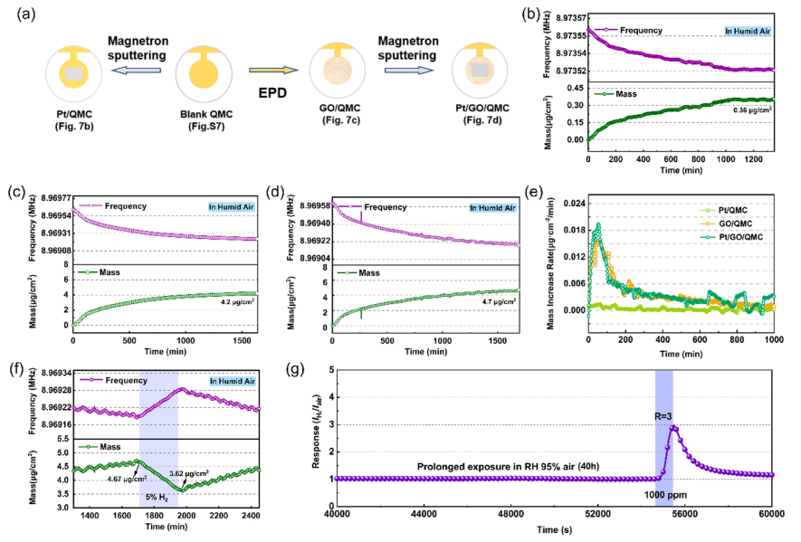 -2 ) 層的制備過程。298 K 時(shí) QMC 上的 (b) Pt 層、(c) GO 層和 (d) Pt/GO 層在 95% RH 空氣中長(zhǎng)時(shí)間存在的頻率和質(zhì)量變化。(e) Pt 層、GO 層和 Pt/GO 層的質(zhì)量增加率。(f) QMC 上的 Pt/GO 層在 95% RH 空氣中對(duì) 5% H