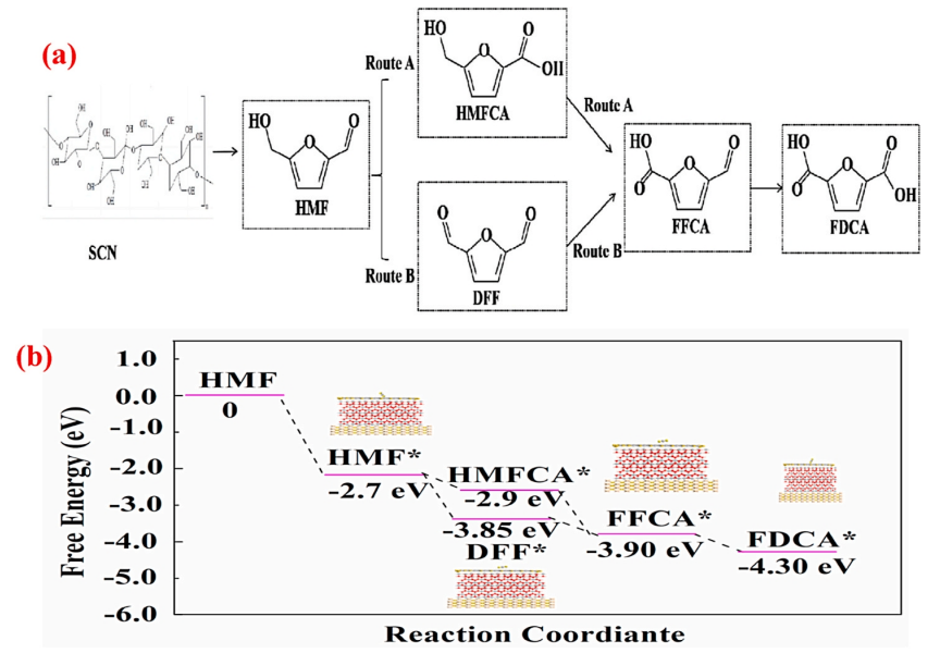 圖12. (a)HMF轉(zhuǎn)化為FDCA的反應(yīng)路徑圖;(b)TC3-GS吉布斯自由能。