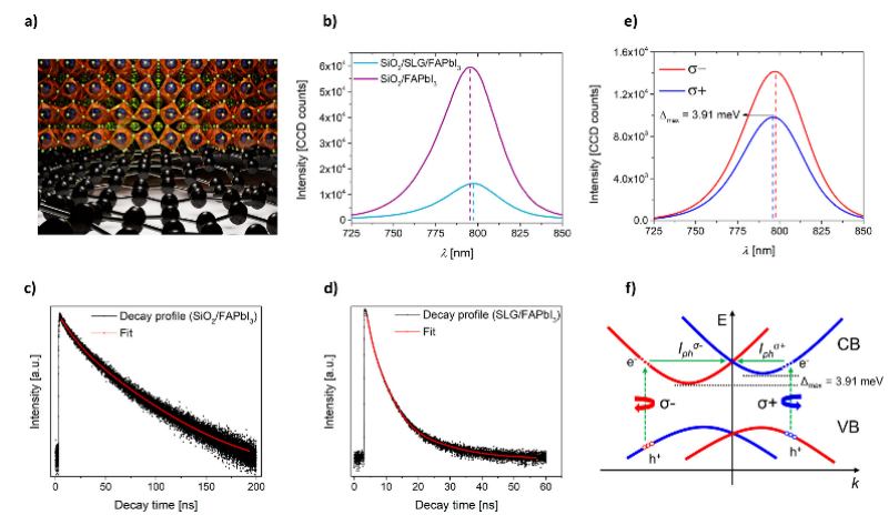 本研究指出在石墨烯上生長的有機-無機復合鈣鈦礦半導體中模板效應的重要性。通過結合兩種非手性材料,我們報道了一種具有電子能帶分裂的手性復合異質結構的形成。在常溫和無磁場條件下,通過石墨烯/α-CH (NH