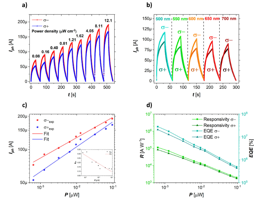CPL。在石墨烯和鈣鈦礦薄膜之間精心設計的界面增強了 Rashba 場,并產(chǎn)生了負責光電流的內置電場,在可見光光子的0.08 μW cm