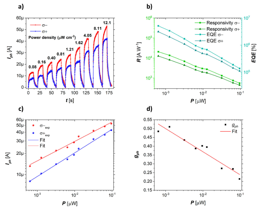 +,藍球)圓偏振500±5 nm激光器測量的自旋極化光電流的功率依賴性響應。(b)采用σ