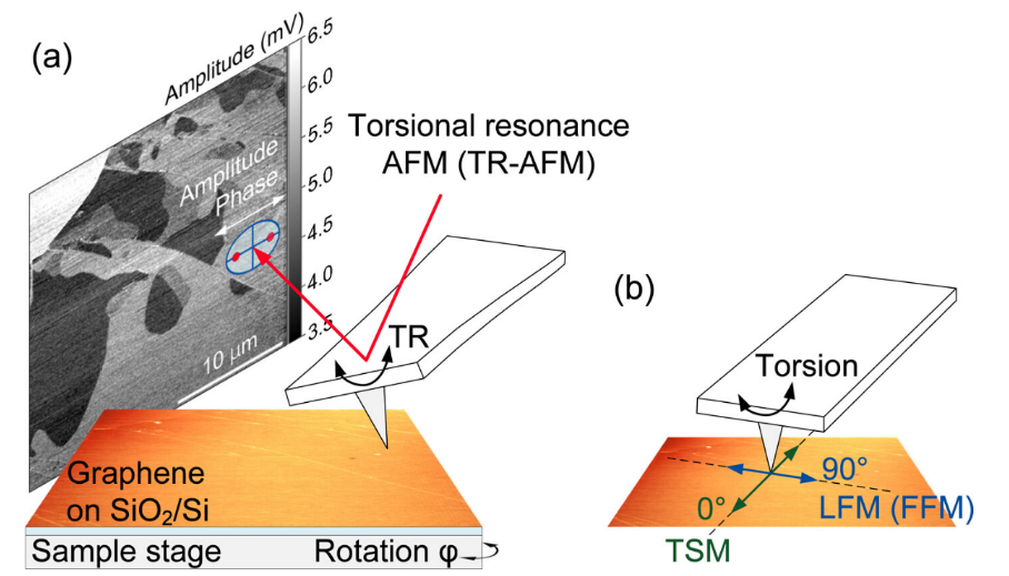 2/Si襯底上的單層石墨烯樣品的示意圖。如圖所示,TR-AFM振幅和相位圖像顯示了石墨烯上的疇,并旋轉(zhuǎn)樣品以研究疇的各向異性特征。(b)說明一般最低調(diào)頻和非常規(guī)最高調(diào)頻的工作原理。