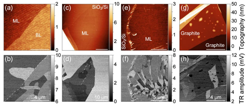 2/Si襯底上的ML石墨烯片,以及(g, h)厚度約為8.3 nm的兩個(gè)石墨片相互堆疊的r - afm形貌(上排)和相應(yīng)的振幅(下排)圖像。圖a中樣品的ML-BL邊界繪制在圖b中(虛線),圖c中樣品的褶皺位置表示在圖d中(虛線)。