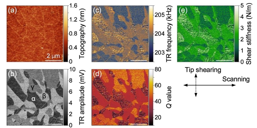 圖5.石墨烯上域的定量面內(nèi)彈性映射。圖2e中單層石墨烯在206khz工作頻率下的放大區(qū)域的TR-AFM (a)形貌和(b)振幅圖像。通過正文中描述的方法獲得的域的TR-AFM (c)頻率和(d) Q值圖。(e)由圖c的頻率圖計(jì)算出的各域的剪切剛度圖。圖中示出了懸臂掃描方向和尖端剪切方向。