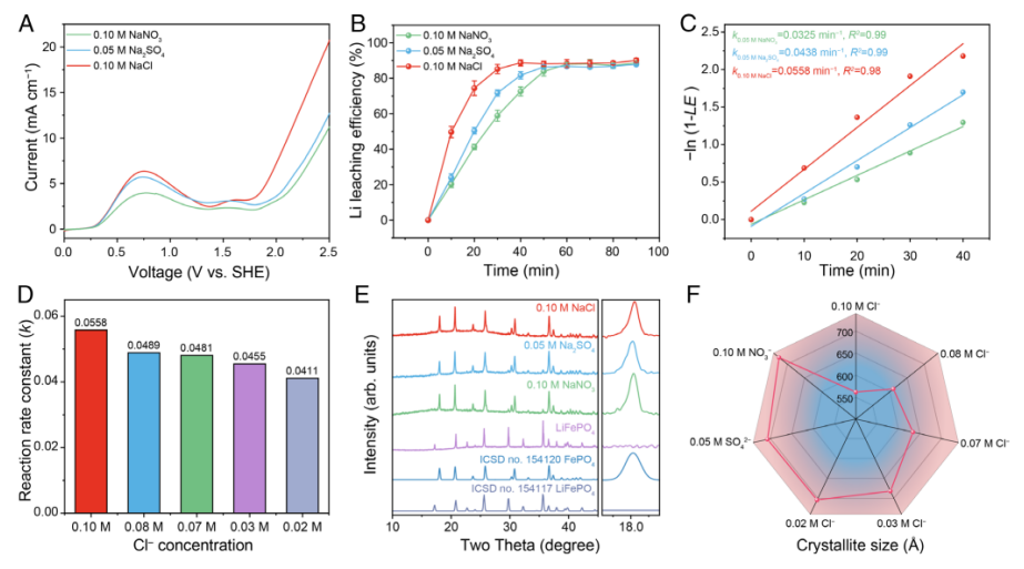 圖 2. 不同電解質(zhì)中 LiFePO4 鋰浸出情況比較。(A) 電化學(xué)極化曲線。(B) 鋰浸出效率、(C) 浸出速率、(D) 計算反應(yīng)速率常數(shù)、(E) XRD 圖案和 (F) 在不同電解質(zhì)中浸出鋰后所得 FePO4 的晶粒尺寸。誤差線表示三次重復(fù)的平均值 ± SD。