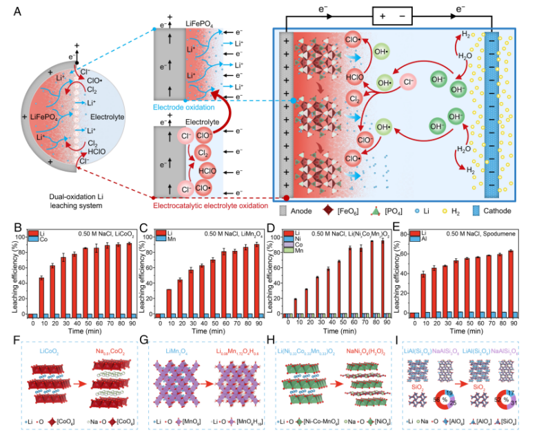 便攜式儲能對鋰的需求無止境,因此必須采用可持續(xù)和低碳的方法來回收鋰。傳統(tǒng)的濕法冶金和火法冶金方法大量涉及危險化學(xué)品和大量二氧化碳排放。在此,通過將電極氧化與電解質(zhì)氧化相結(jié)合,我們建立了光伏驅(qū)動的“雙氧化”海水電解槽系統(tǒng),以實現(xiàn)低碳足跡和高鋰回收率。從廢舊 LiFePO4 正極材料中回收鋰的鋰浸出率為 98.96%,產(chǎn)品純度為 99.60%。深入的機理研究表明,電場驅(qū)動的電極氧化和原位生成的氧化電解質(zhì)通過結(jié)構(gòu)框架元素氧化和顆粒腐蝕分裂協(xié)同作用協(xié)同促進鋰離子浸出。這種雙氧化機制有利于快速、高效地提取鋰,具有廣泛的普適性,具有顯著的經(jīng)濟和環(huán)境效益。我們的工作展示了一種在光伏驅(qū)動海水電解器中集成雙重氧化的有前景的策略,為在可持續(xù)循環(huán)經(jīng)濟中從各種固體廢物和礦物中低碳回收鋰鋪平了道路。