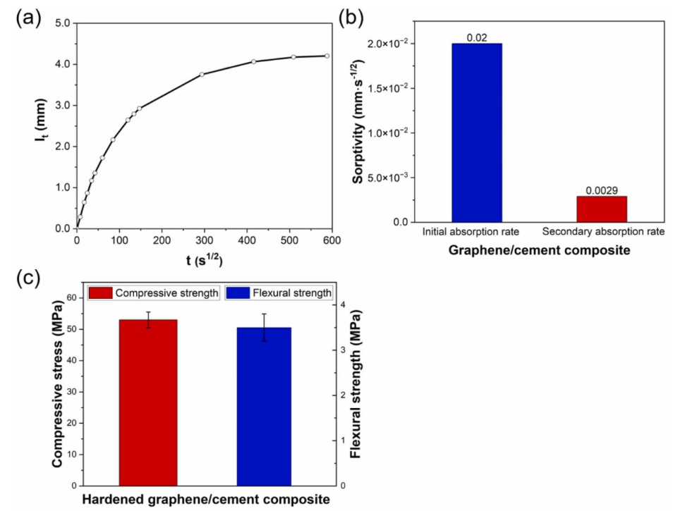 圖 2. 石墨烯-水泥復(fù)合材料的物理和機(jī)械性能:(a)吸水率;(b)一次和二次吸附率;(c)抗壓強(qiáng)度和抗彎強(qiáng)度。